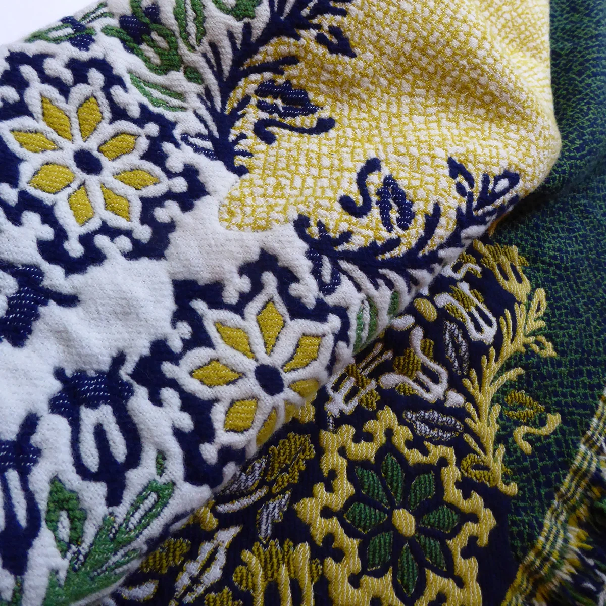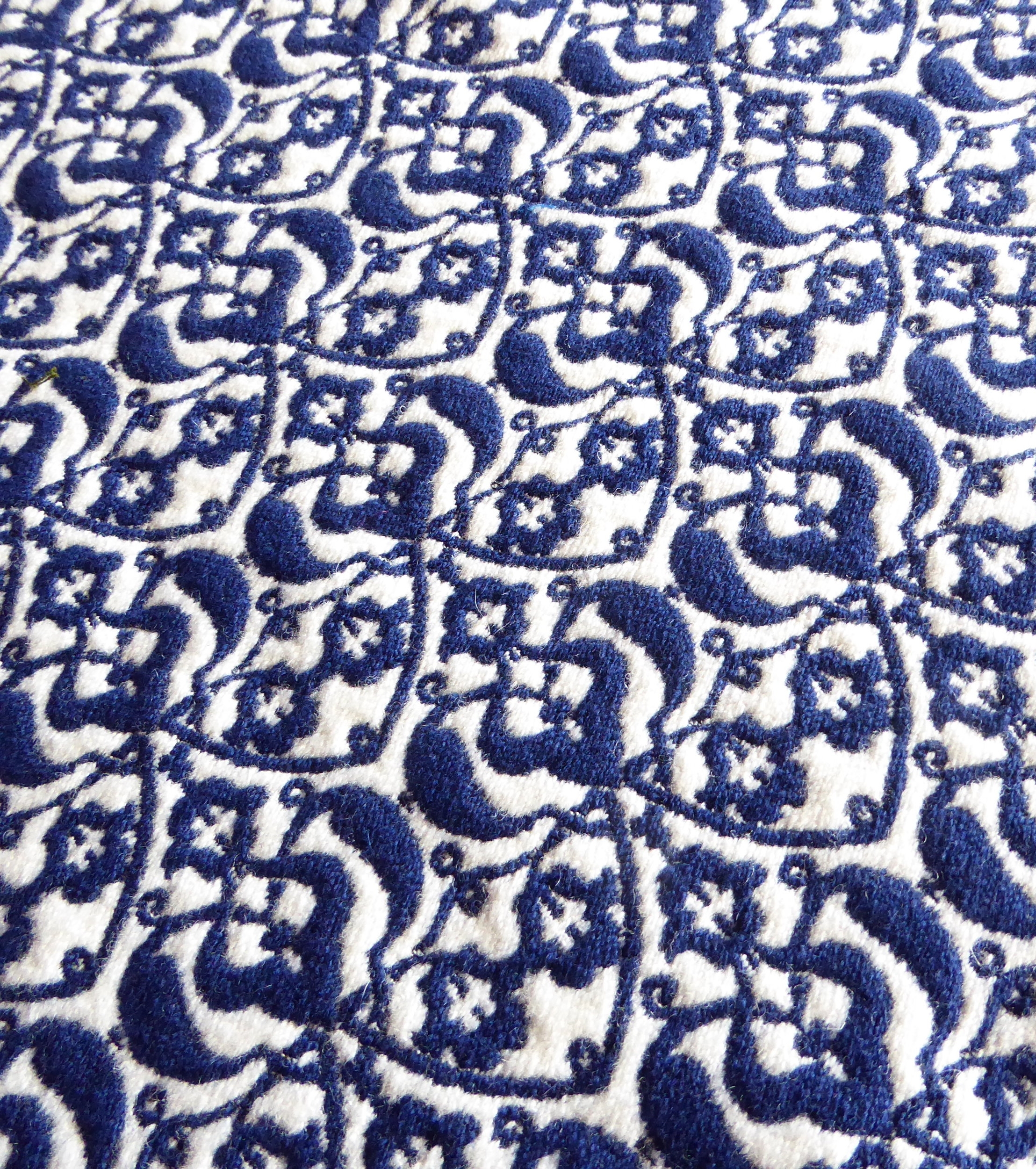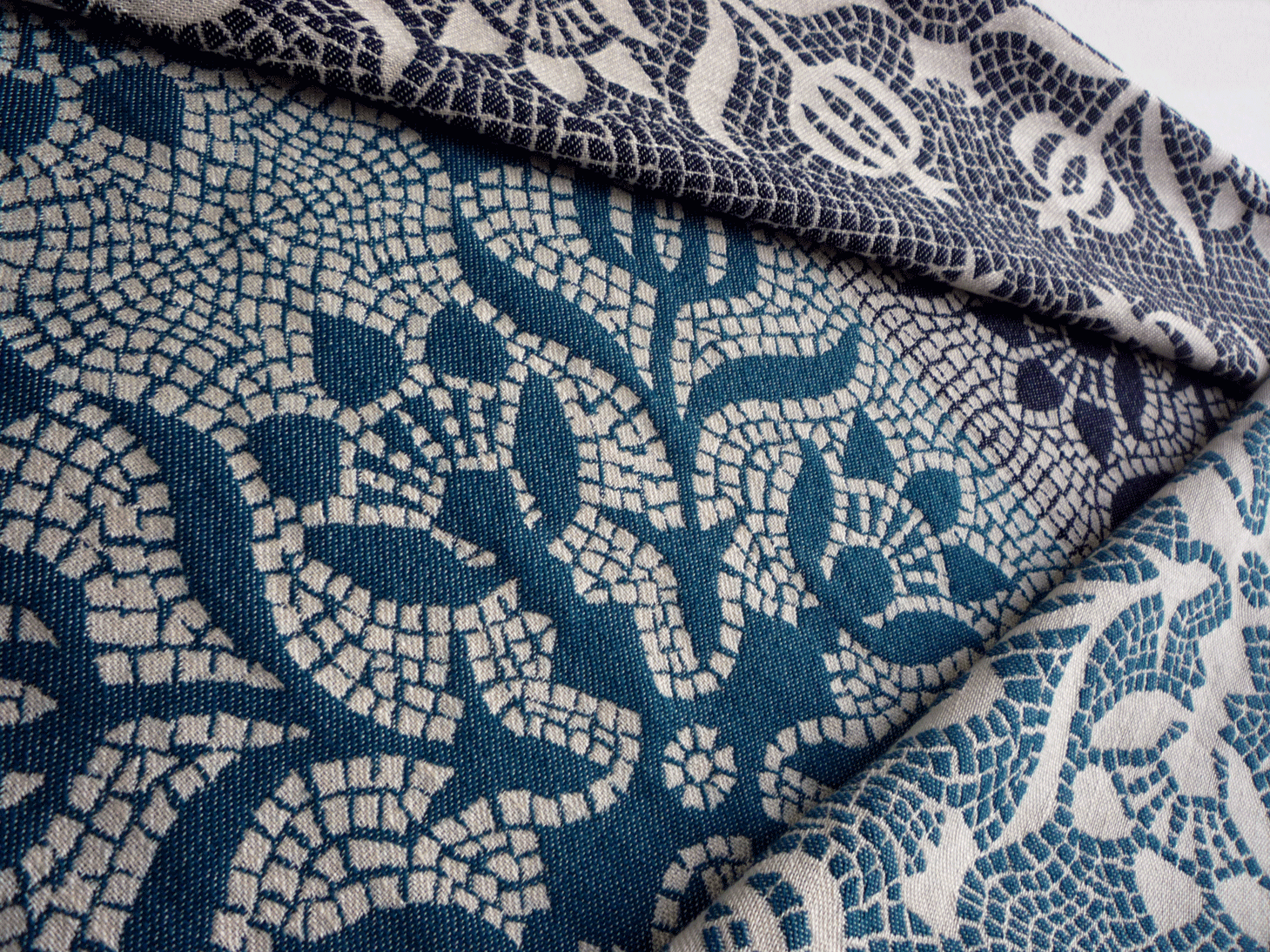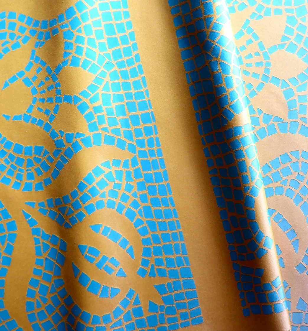 Jacquard woven mosaic inspired fabrics with cotton warp and 50% wool 50% silk weft.