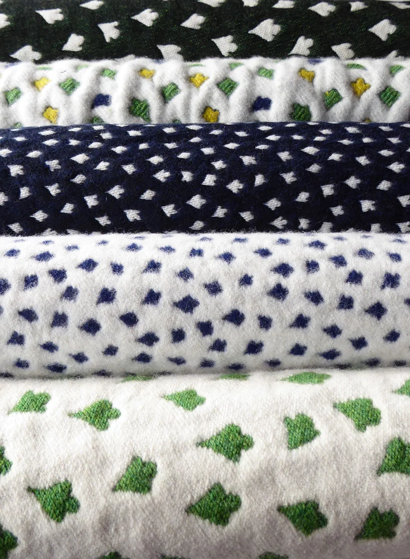 Woven here in the UK on a jacquard loom, these soft, textural fabrics are hand finished to achieve their unique and luxurious handle. The Merino yarn is thick and springy but lightweight too, Ideal for apparel and soft furnishings alike.